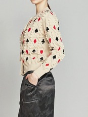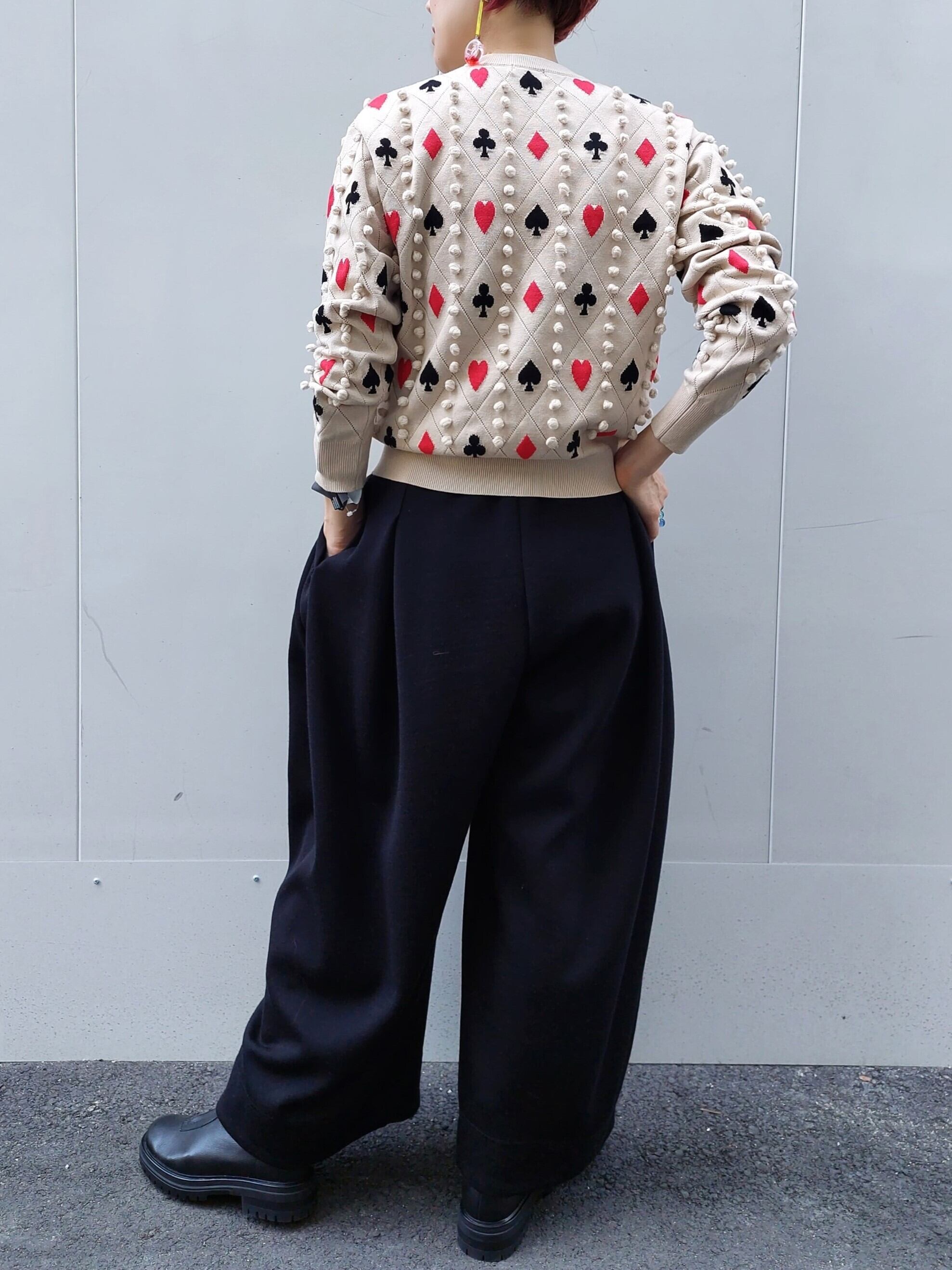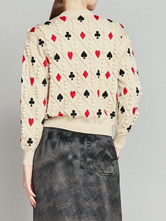 アーガイルの透かし柄を入れながら、同じコースに違う柄を編み立てるという高度なテクニックを駆使しています。また、ハンドメイドのポップコーンを一点一点ハンドメイドで施しているのもポイント。とても手の込んだディテールで、デザイン性と特別感のあるアイテムです。