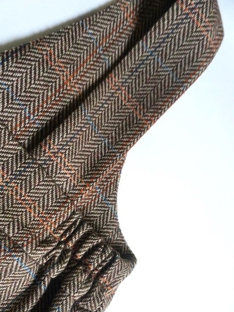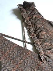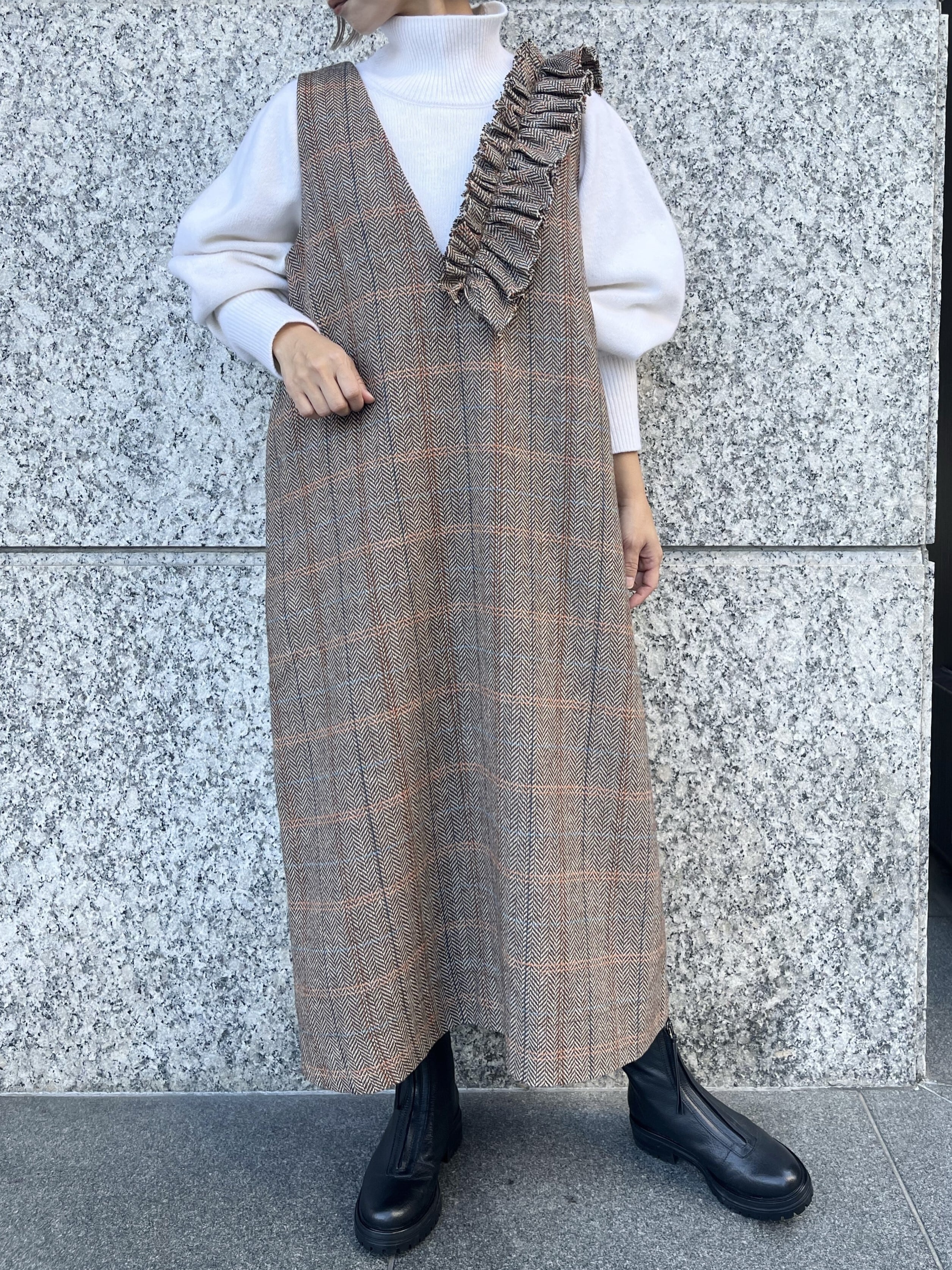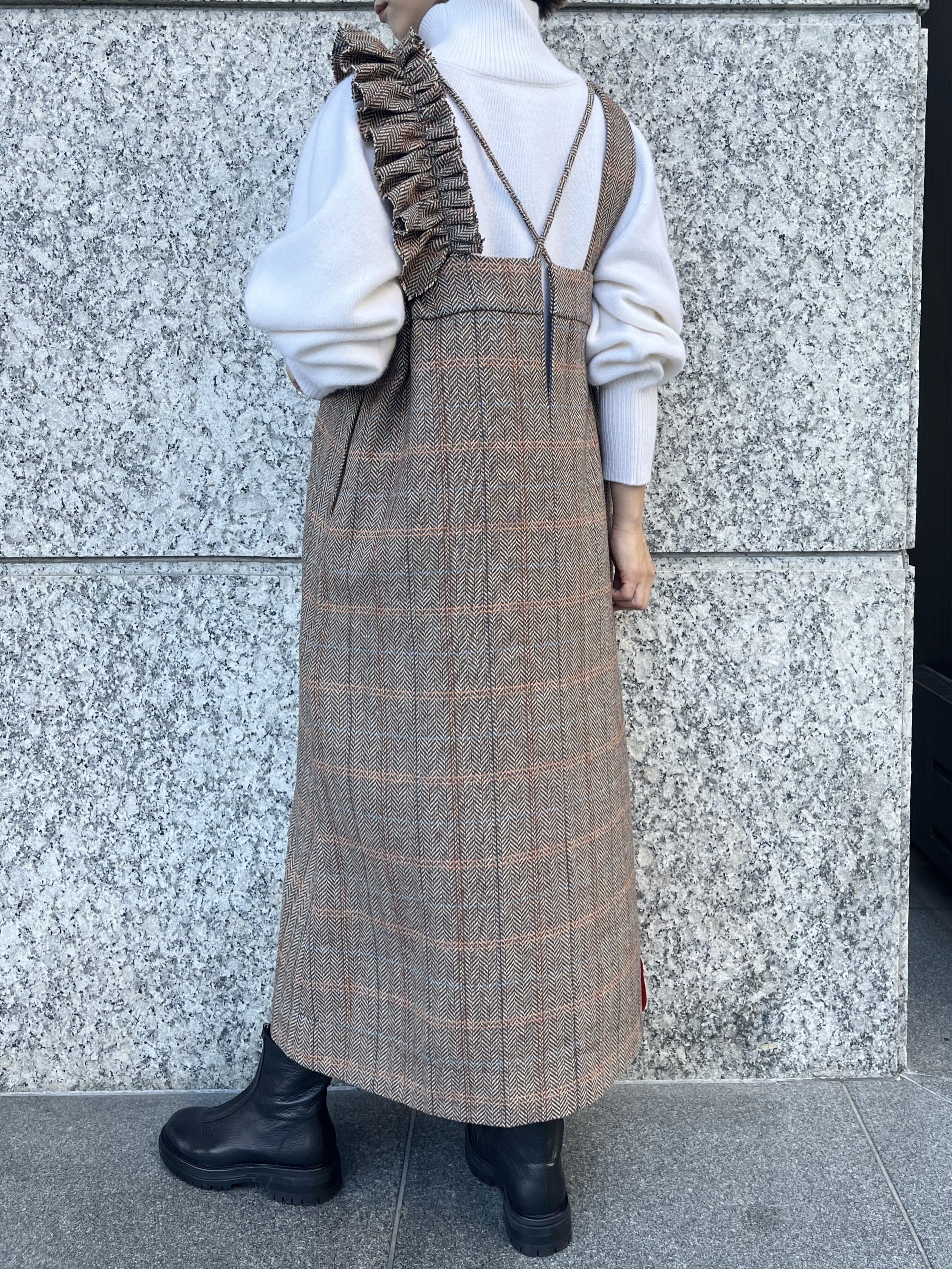 アシンメトリーのフリルが甘すぎず、今回はヘリンボーンのハリのあるウールを使用。