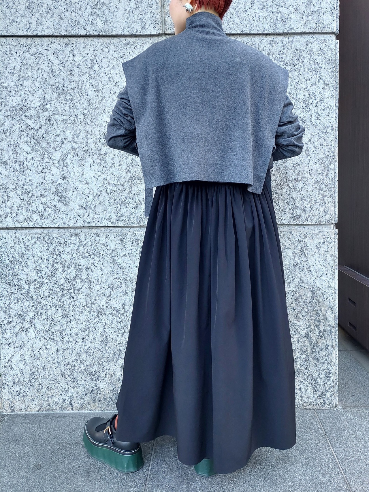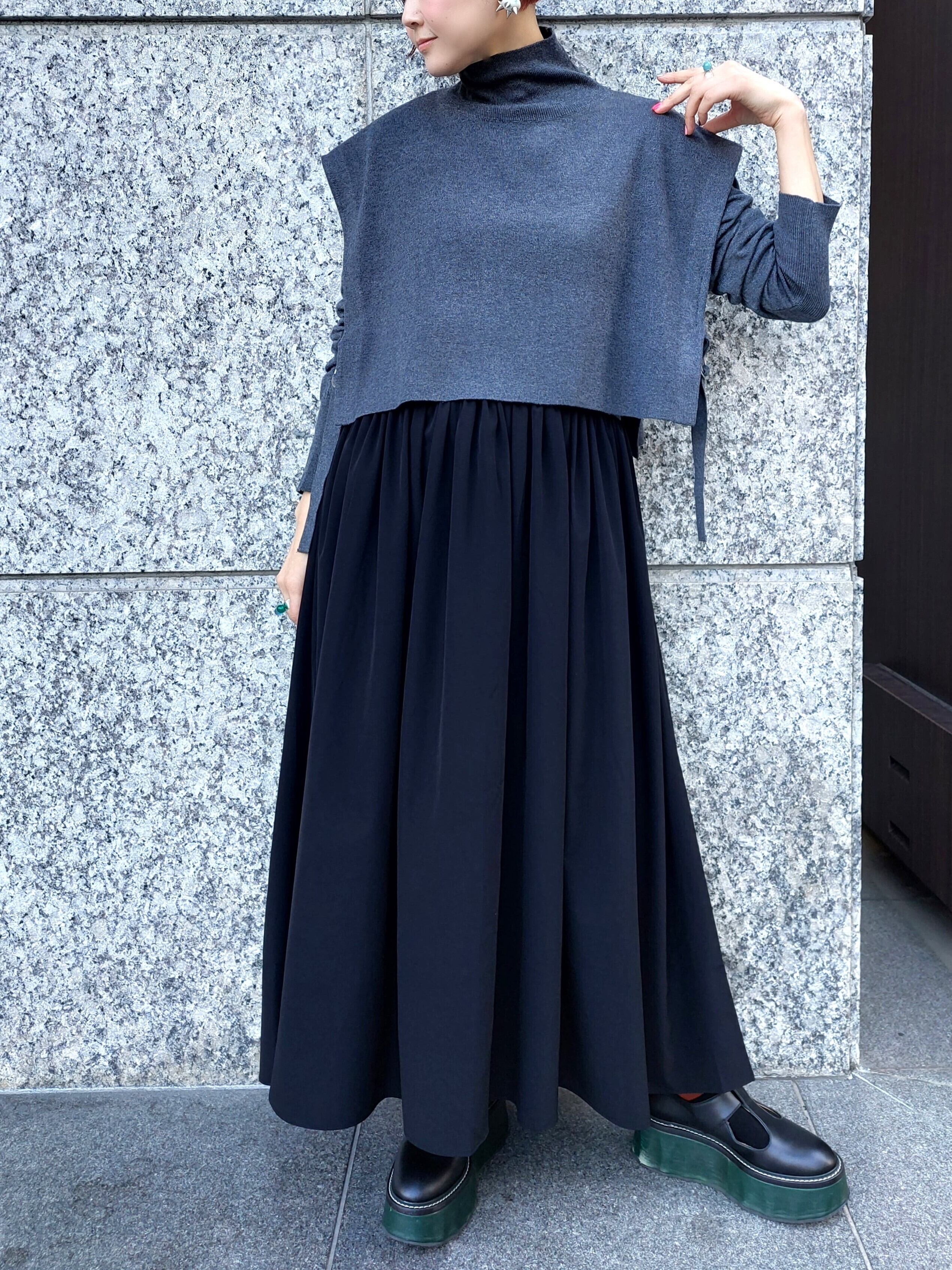 ハイネックの肌触り良いニットと、布帛切替ワンピースにハイネックジレをレイヤードしたセットアイテム。